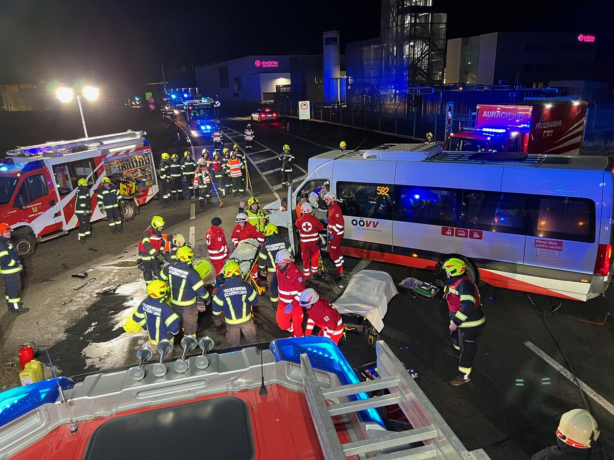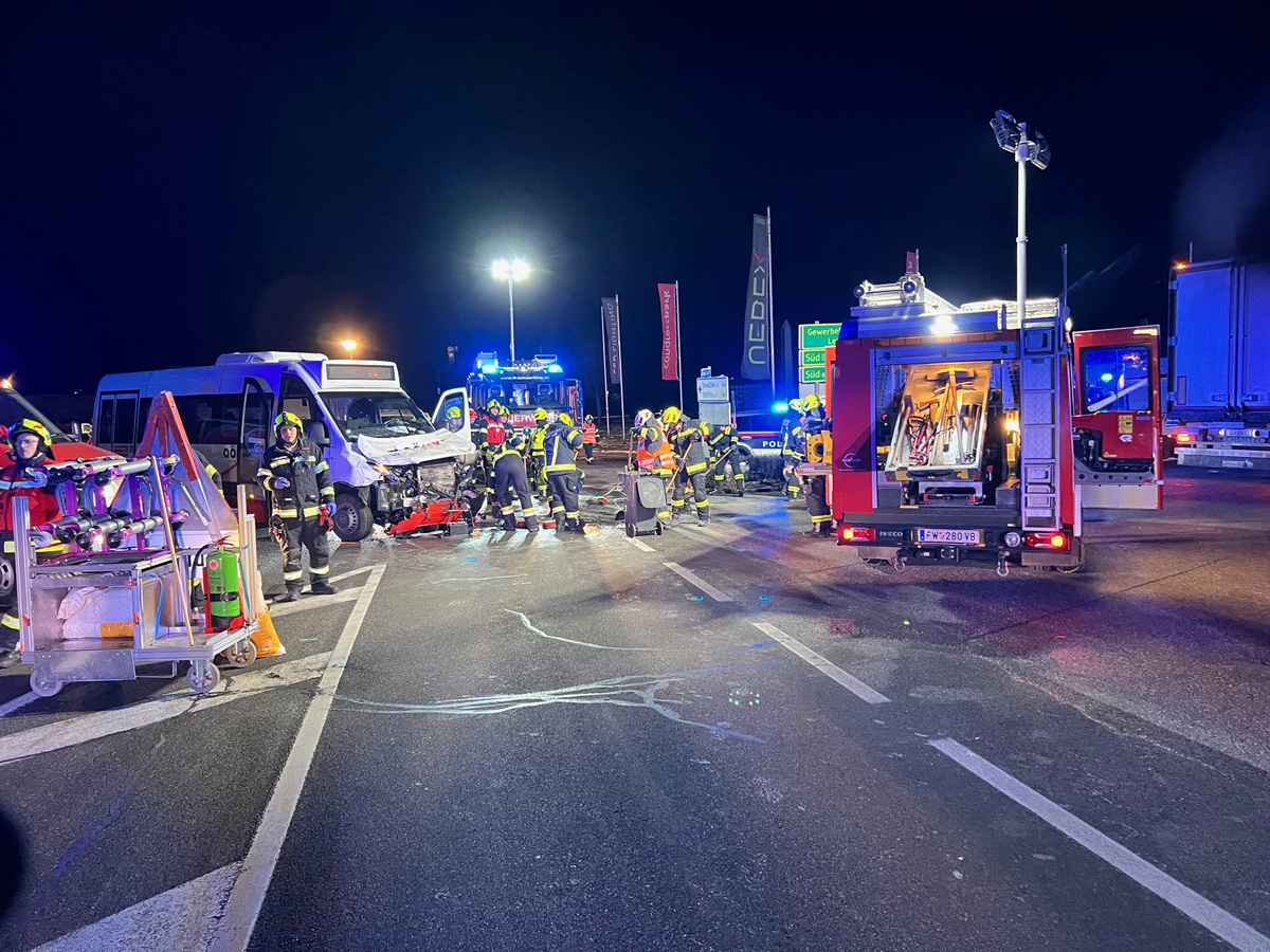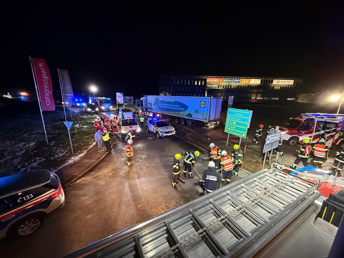 Beim Eintreffen an der Einsatzstelle führte unser Einsatzleiter umgehend eine umfassende Lageerkundung durch. In den Unfall waren ein E‑LKW sowie ein Kleinbus verwickelt. Die Lenkerin des Kleinbusses war schwer verletzt. Ein weiterer Fahrgast befand sich ebenfalls im Bus und war augenscheinlich leichter verletzt. Beide wurden bereits vom Roten Kreuz versorgt.