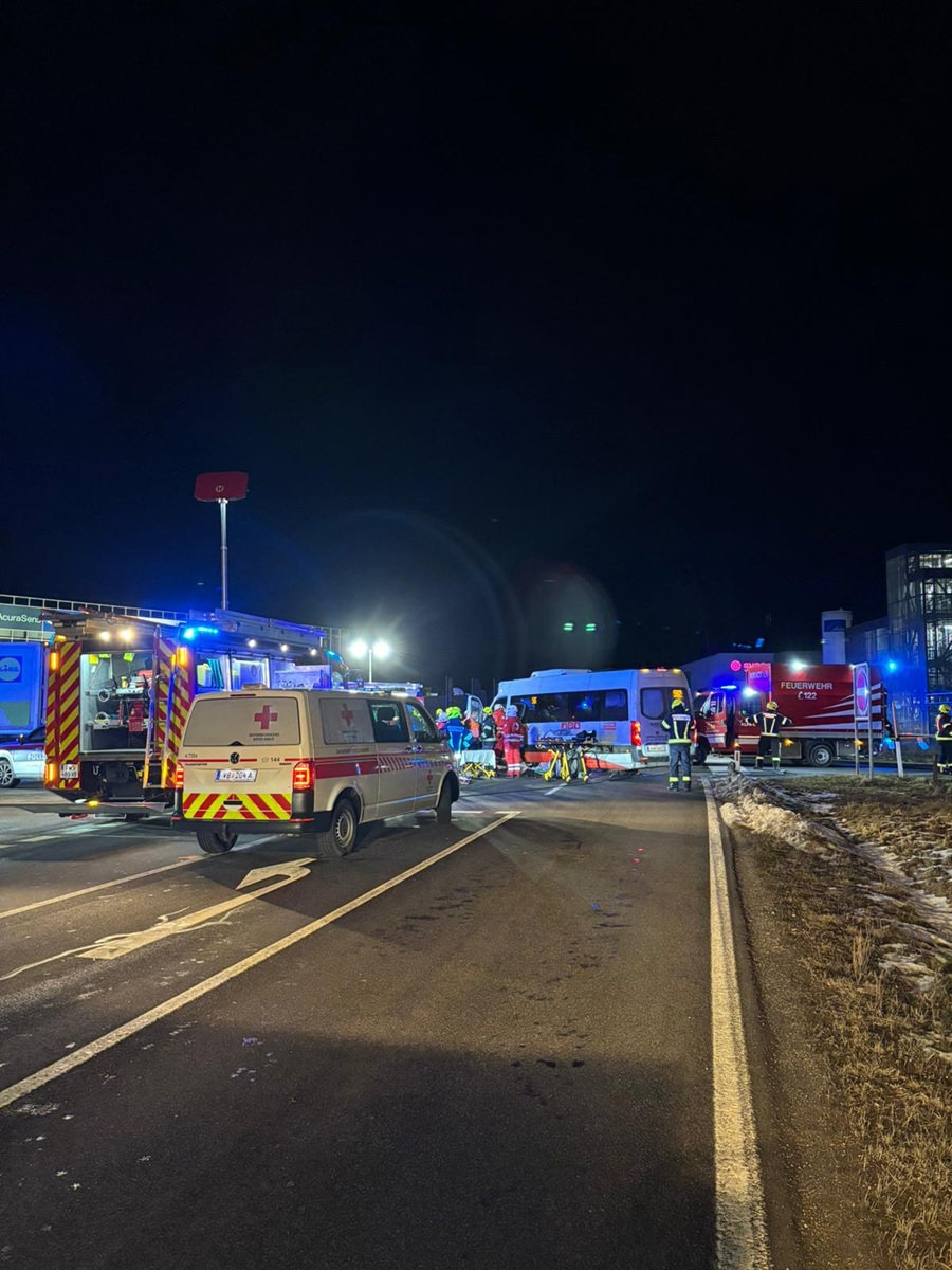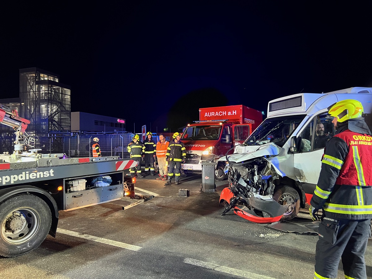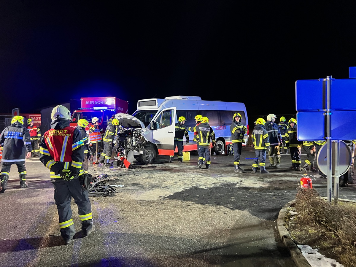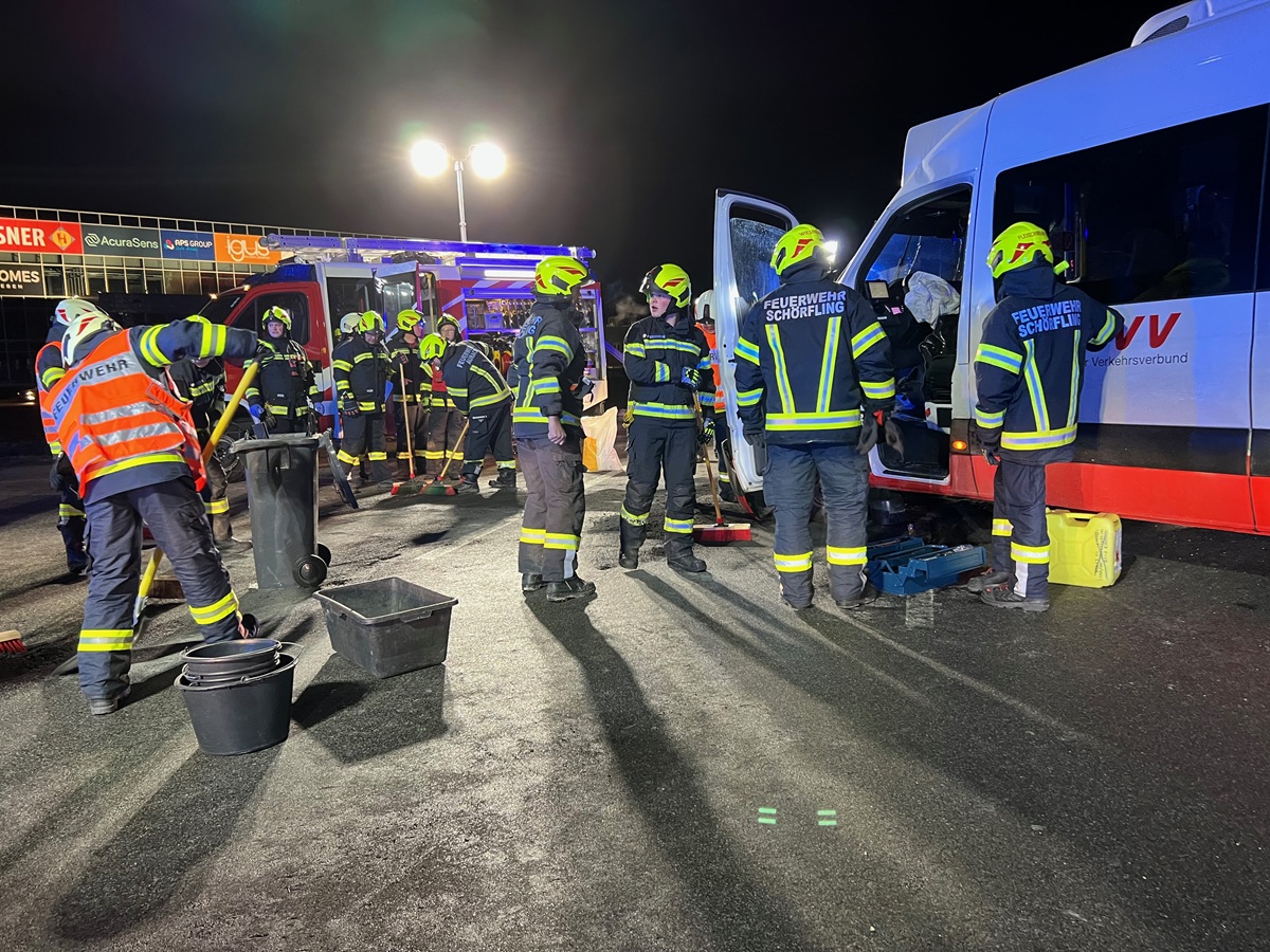 Beim Eintreffen an der Einsatzstelle führte unser Einsatzleiter umgehend eine umfassende Lageerkundung durch. In den Unfall waren ein E‑LKW sowie ein Kleinbus verwickelt. Die Lenkerin des Kleinbusses war schwer verletzt. Ein weiterer Fahrgast befand sich ebenfalls im Bus und war augenscheinlich leichter verletzt. Beide wurden bereits vom Roten Kreuz versorgt.