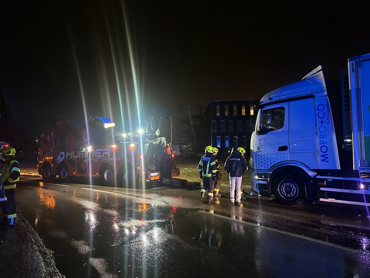 Für die Bergung des E‑LKWs wurde eine Fachfirma hinzugezogen. Während der gesamten Arbeiten wurde ein durchgängiger Brandschutz aufrechterhalten. Nachdem beide Unfallfahrzeuge abtransportiert waren und alle Gefahrenquellen beseitigt wurden, konnten wir wieder einrücken und die Einsatzbereitschaft herstellen.