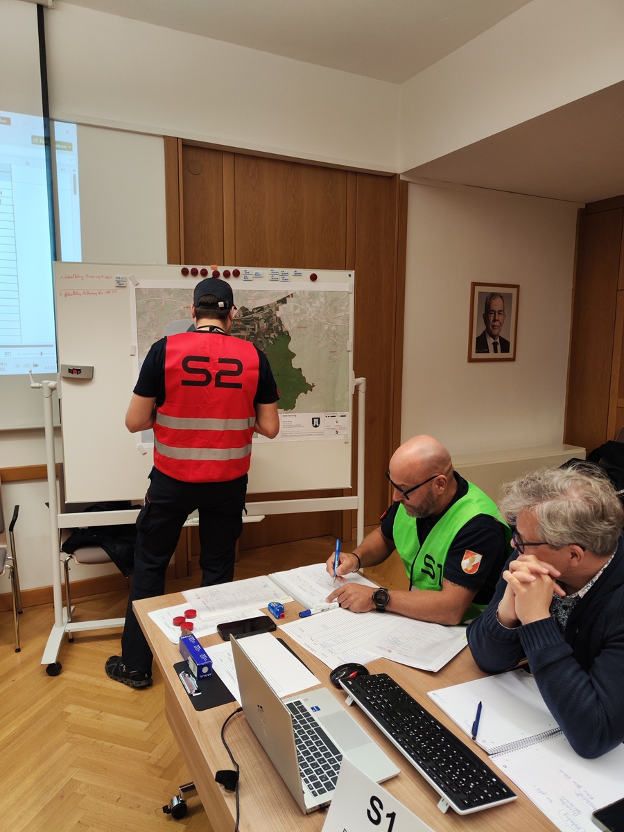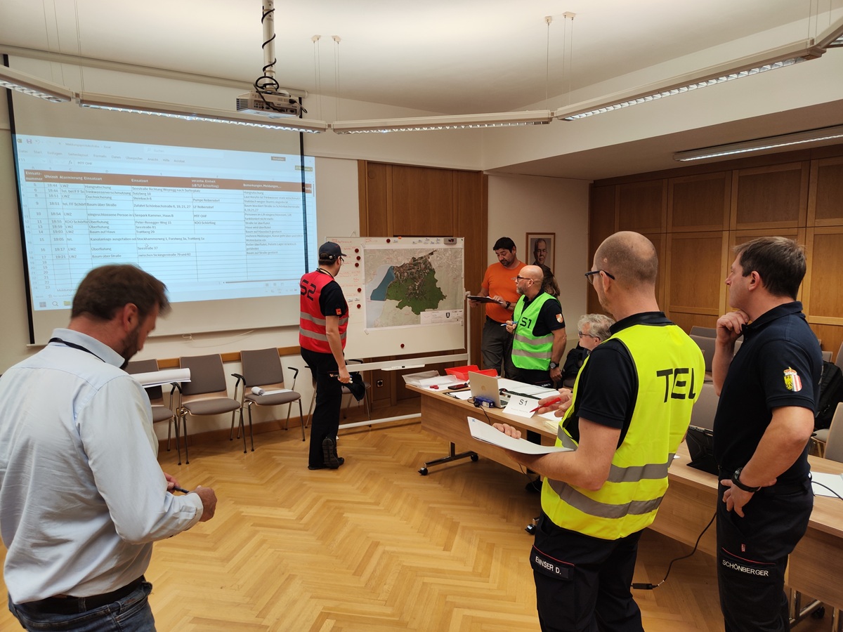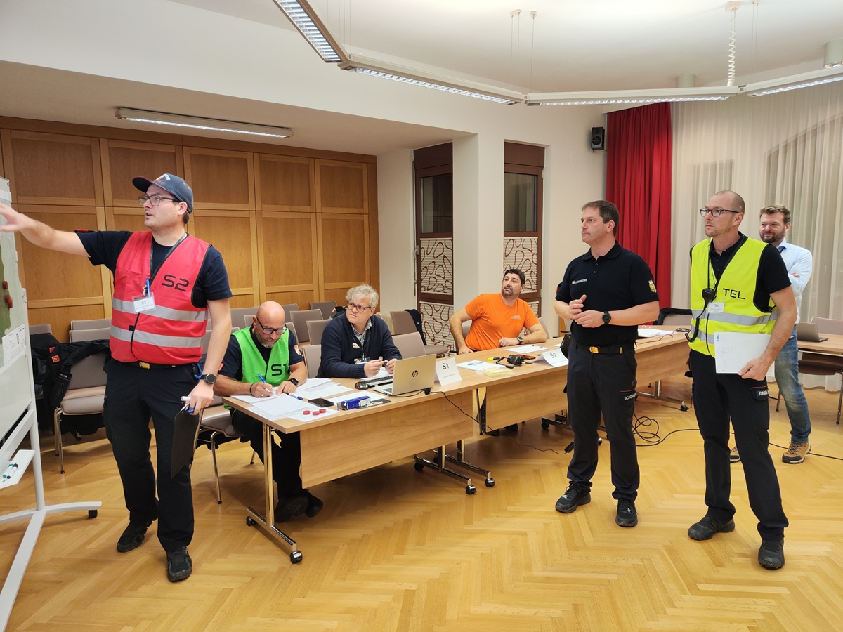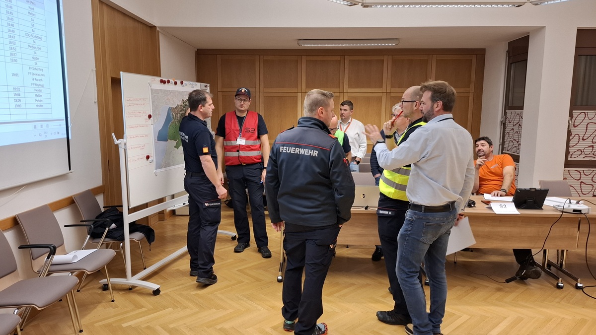 Nach einer Aufwärmphase wurde die Geschwindigkeit der Einsatzmeldungen schrittweise erhöht. Somit wurde die Stabsarbeit immer weiter ausgebaut und einem Stresstest unterzogen. Damit die Mitglieder des Krisenstabes einen realistischen Ablauf üben konnten, stand im Feuerwehrhaus Schörfling einige Kameraden bereit, die als „einzelne Fahrzeugkommandanten“ auftraten. Diese Fahrzeugkommandanten bekamen direkt vom Stab die Einsatzaufträge übermittelt.