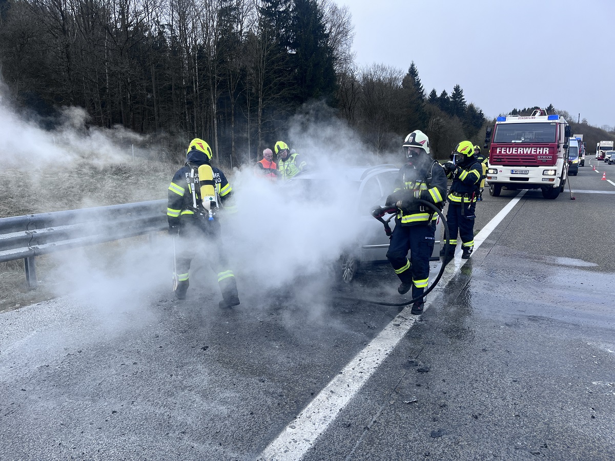 Umgehend rückte unsere Einsatzmannschaft zum Einsatzort aus. Bei Ankunft unseres TLF stand der vordere Teil des PKW´s bereits in Vollbrand. Umgehend wurde von unserem Atemschutztrupp ein Löschangriff gestartet, welcher auch rasch Erfolg zeigt. Nach kurzer Zeit war das Auto dann vollständig gelöscht. Anschließend wurde eine Nachkontrolle mittels Wärmebildkamera durchgeführt.