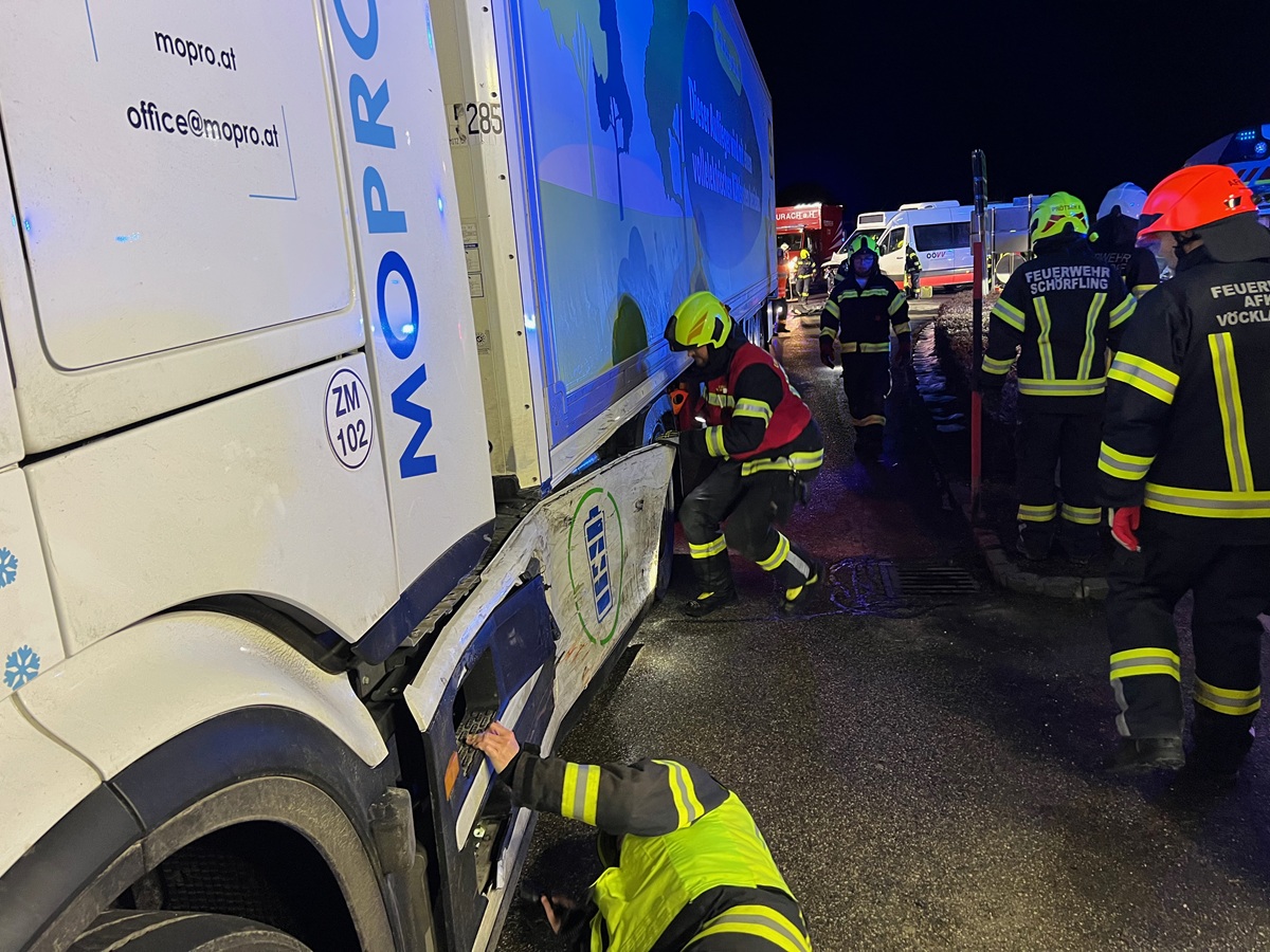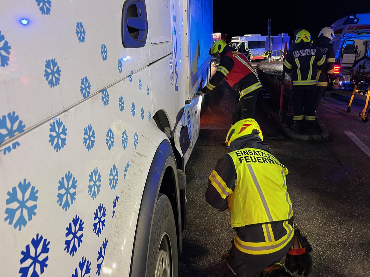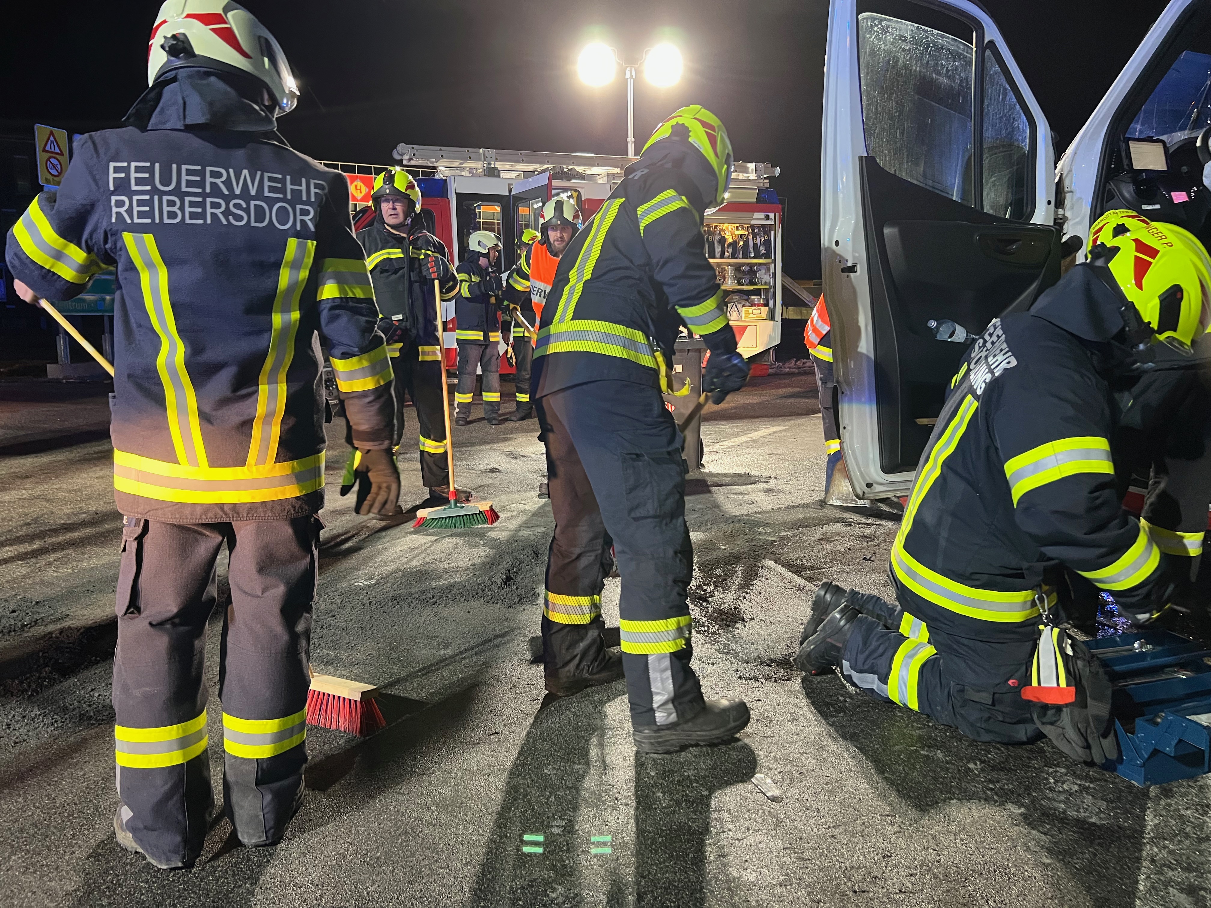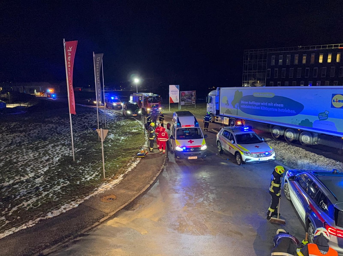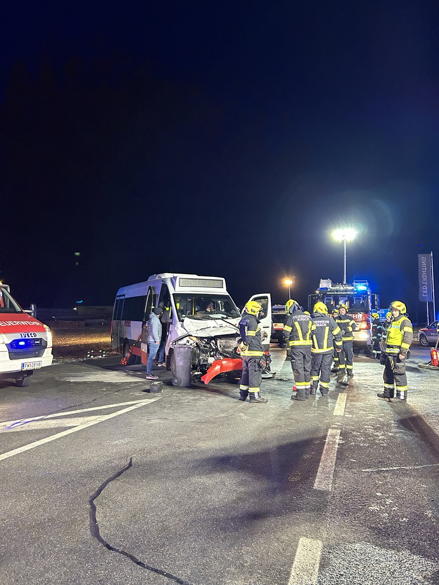 Beim Eintreffen an der Einsatzstelle führte unser Einsatzleiter umgehend eine umfassende Lageerkundung durch. In den Unfall waren ein E‑LKW sowie ein Kleinbus verwickelt. Die Lenkerin des Kleinbusses war schwer verletzt. Ein weiterer Fahrgast befand sich ebenfalls im Bus und war augenscheinlich leichter verletzt. Beide wurden bereits vom Roten Kreuz versorgt.