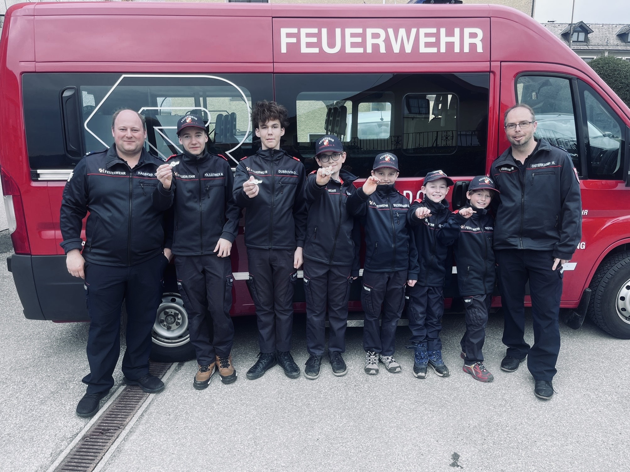 Unter der engagierten Leitung von Harald Osterkamp (links) und Gerald Haidinger (rechts) wächst bei uns die nächste Generation heran: Aktuell zählen 19 motivierte Mädchen und Burschen zur Jugendgruppe, die mit Begeisterung, Teamgeist und Einsatzfreude den Feuerwehralltag kennenlernen und mitgestalten.